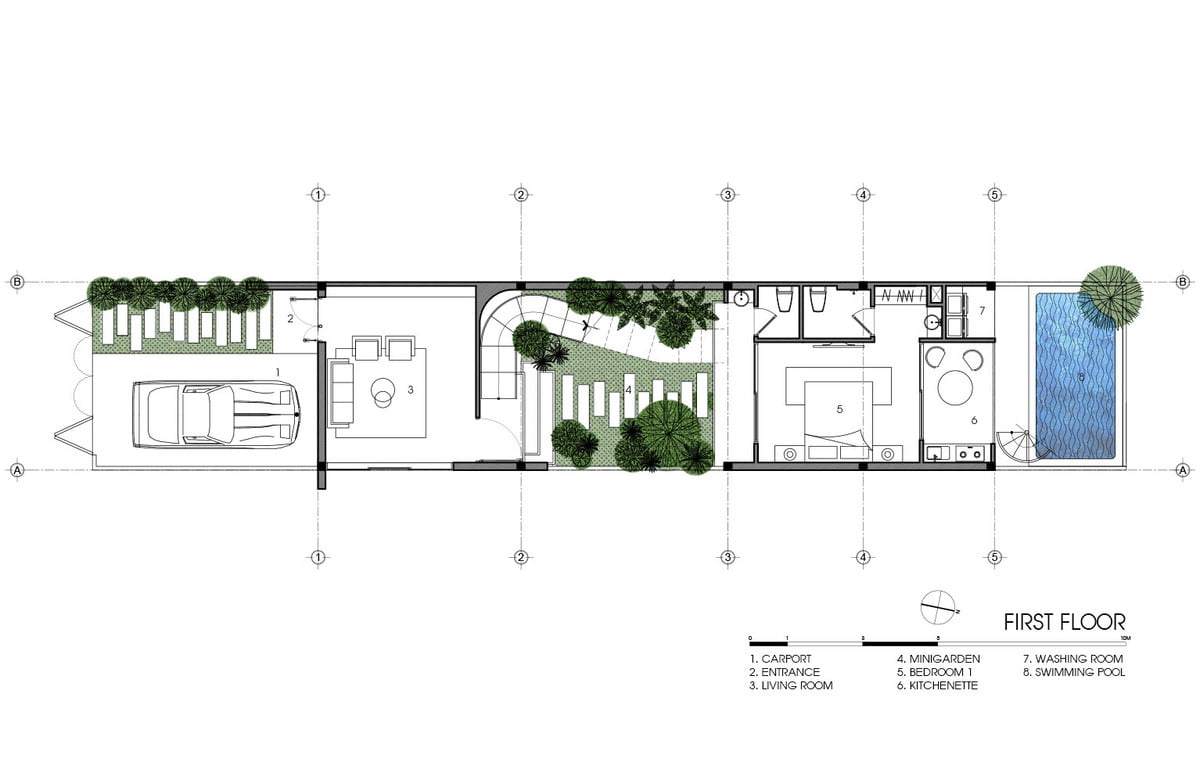 Ngôi nhà có diện tích 5x20m là tổ ấm của gia đình gồm ba mẹ, con trai và con dâu. Yêu cầu đặt ra là cả 2 gia đình đều phải có môi trường sinh hoạt riêng tư, không quá chung nhau nhưng cũng phải có sự kết nối gắn bó với nhau trong căn nhà. Yêu cầu này đã tạo nên ý tưởng thiết kế chính cho căn nhà.