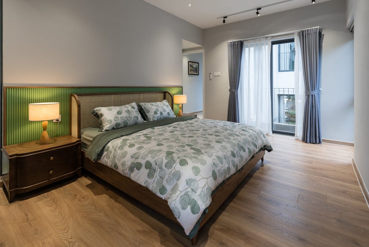 Sau phòng khách là khoảng sân mở lớn cùng cầu thang ngoài trời để lên tầng trên. Bước qua khoảng sân vườn lớn là phòng ngủ ông bà, bếp và bàn ăn nhỏ. Nơi ông bà nghỉ ngơi sinh hoạt đảm bảo sự riêng tư và yên tĩnh.